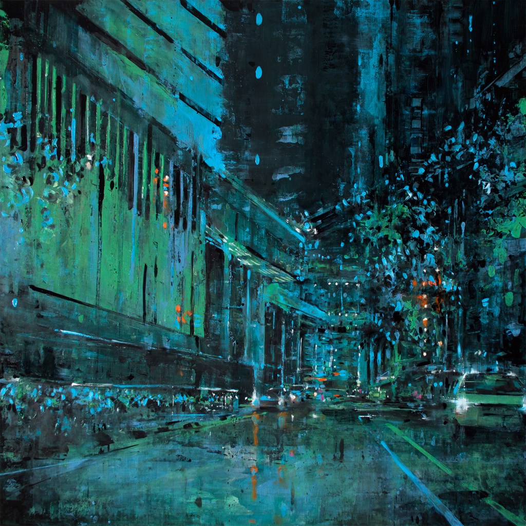 Most details are done away in place of mood and the paintings are generally completed in a few sittings. The paintings are a way to extend the romantic appreciation of architecture. A nostalgic nod to the city, its space and the concept of decay. It’s not my intention to paint scenes with lots of details, but in a more reasonable way of painting the mood of the city and it’s nocturnal energy.