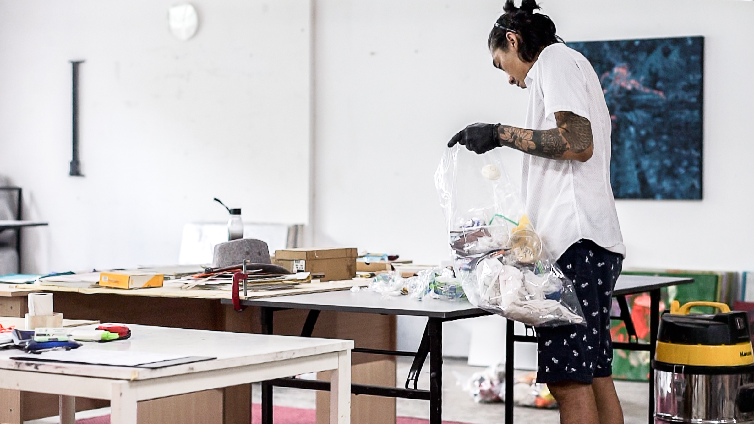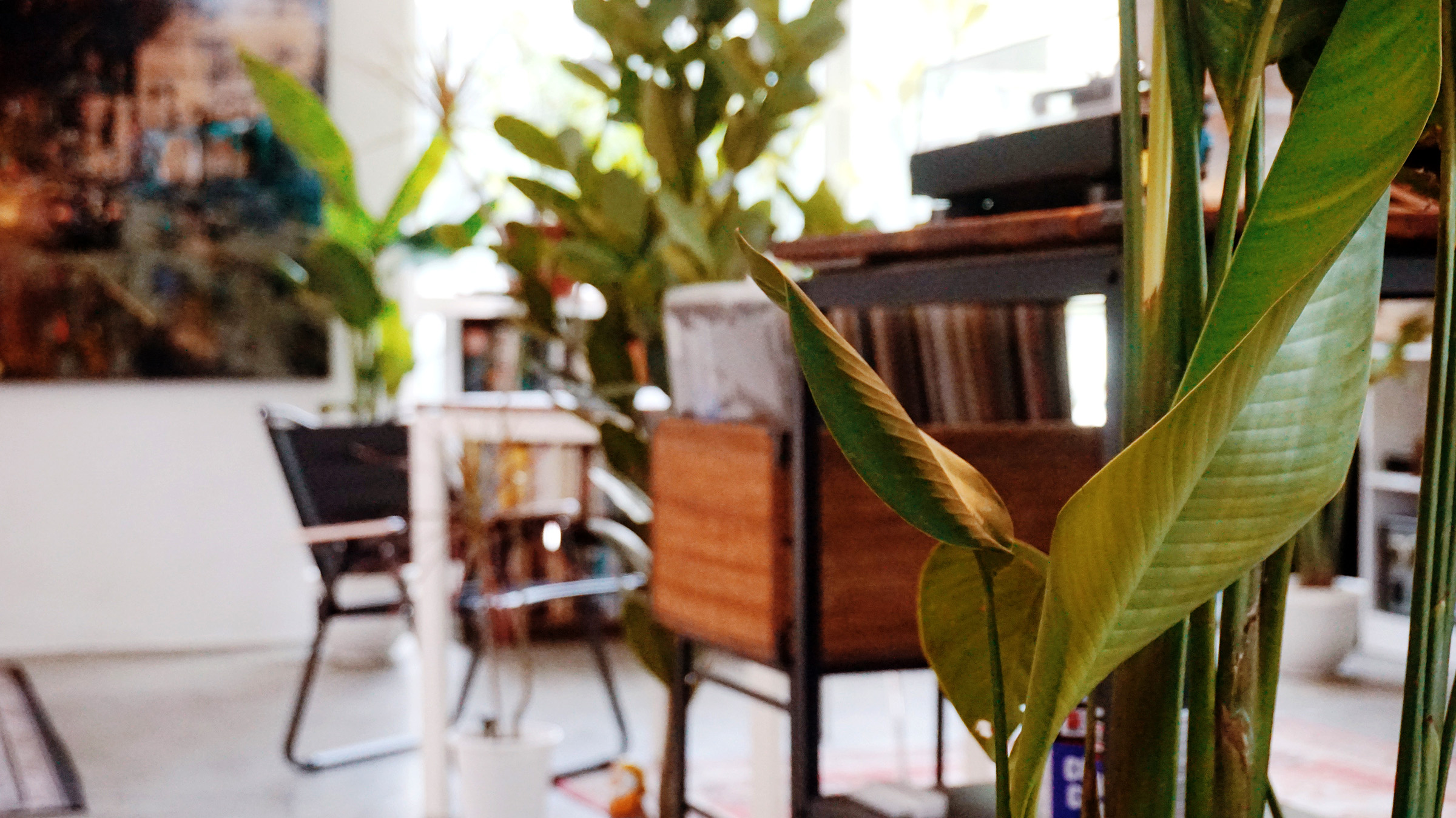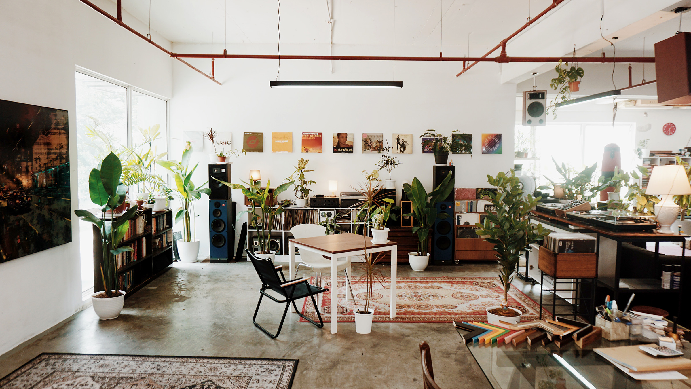 White walls permeate the entire space. Sunlight filters in throughout the studio. Airy summer winds sweep through the space which allow all manners of dreams to be realized. It also functions as a storage space for my artworks, sound system, plants, furniture, books and also houses an array of frame making machines and wood – readily available in all shapes, colors and sizes for any framing needs that may arise. Glass, steel, a guillotine, cutters, boards, acrylic and perspex, stretchers, brushes (synthetic bristle and natural) in long and short handles, flats, turpentine, thinners, isopropyl alcohol, industrial grade shellacs and varnishes, bitumen, sand, polyethylene – the materials jostle for space in the studio : Everything is in its place and there’s a place for everything.